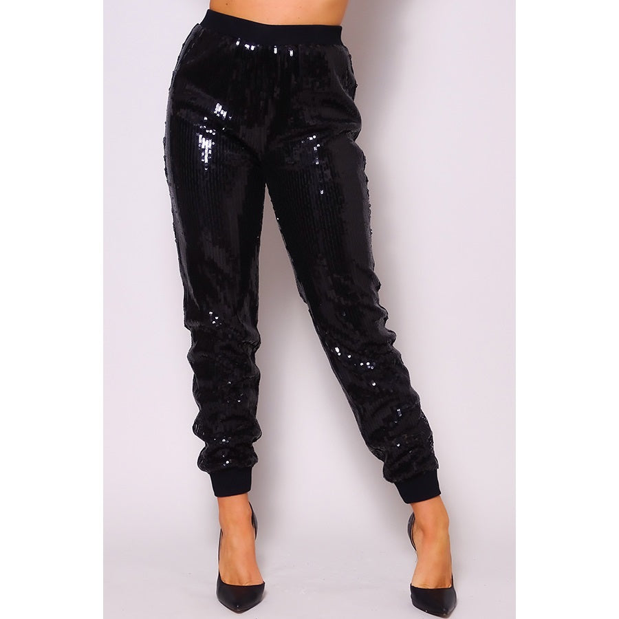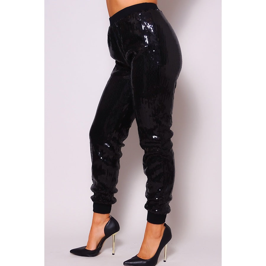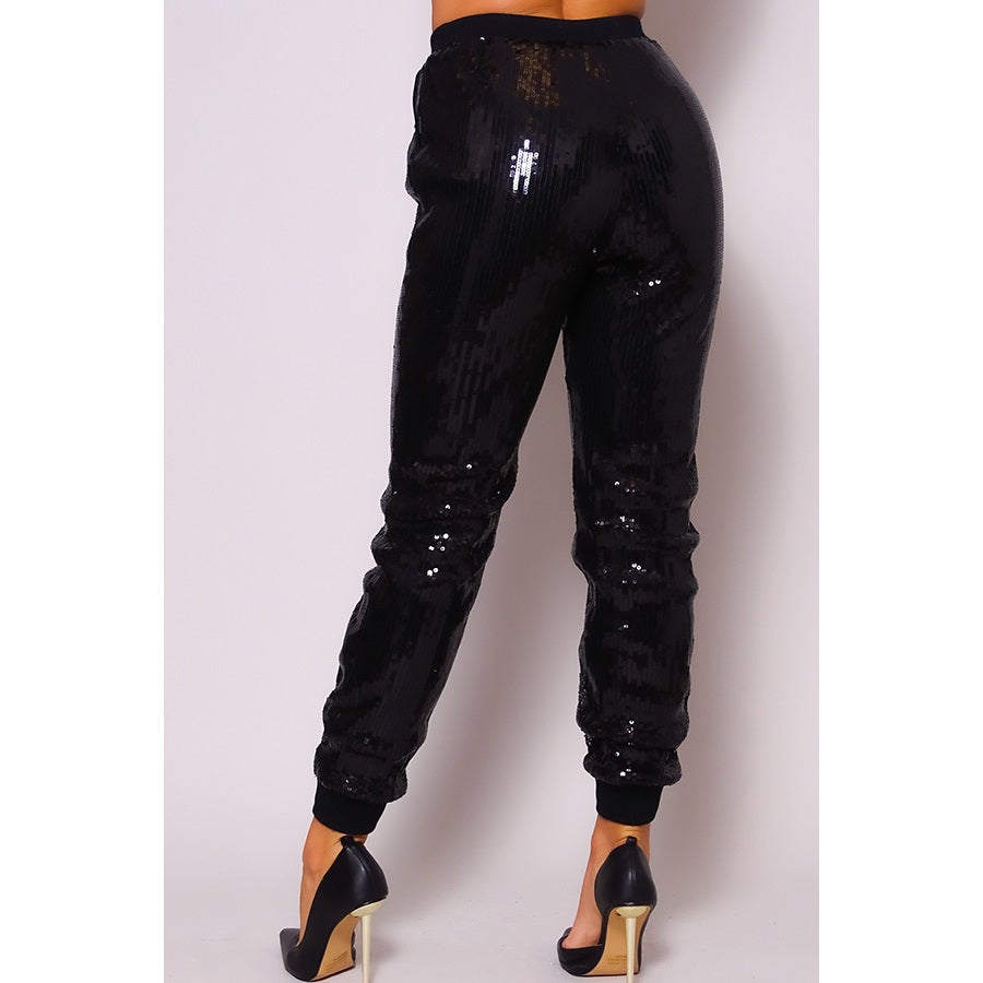 Black Sequin Jogger Pants with Black Trim – Effortless Glam Style