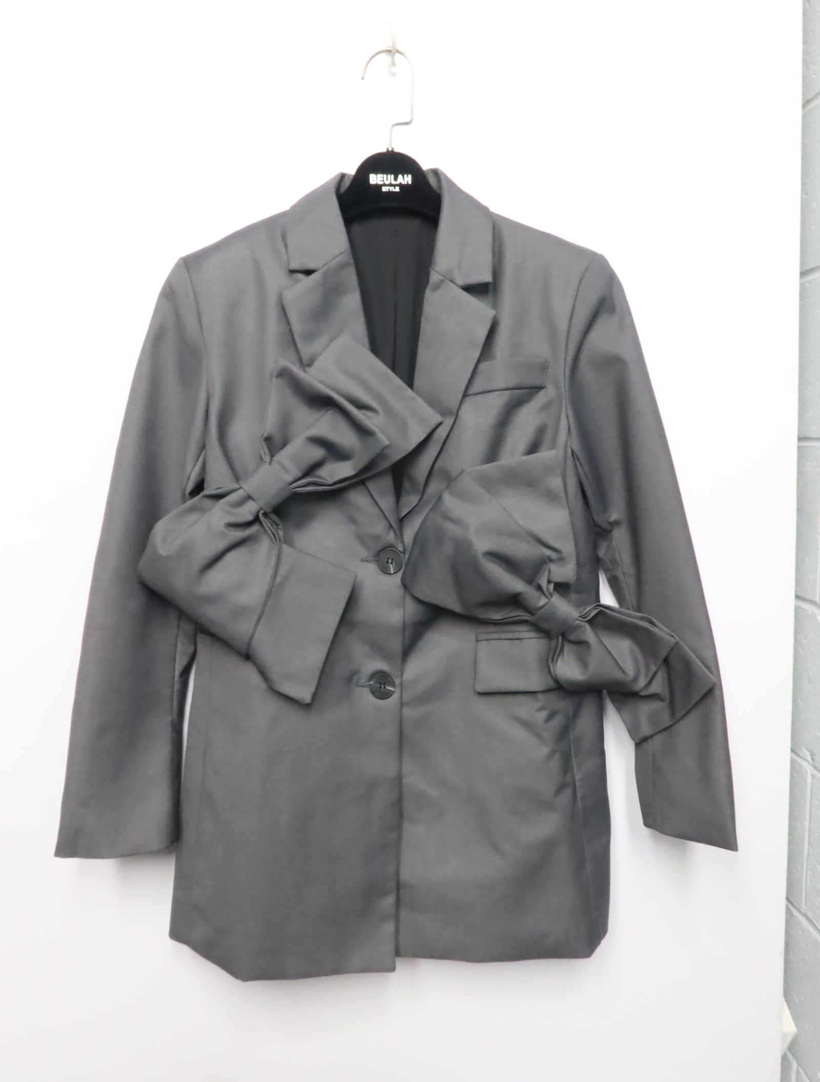 Bring modern sophistication and feminine charm to your wardrobe with this charcoal bow detail blazer. Designed with two front buttons and two oversized statement bows, this piece redefines classic tailoring with a playful, elevated twist. The structured silhouette and mid-weight fabric make it a standout choice for both polished workwear and evening styling.