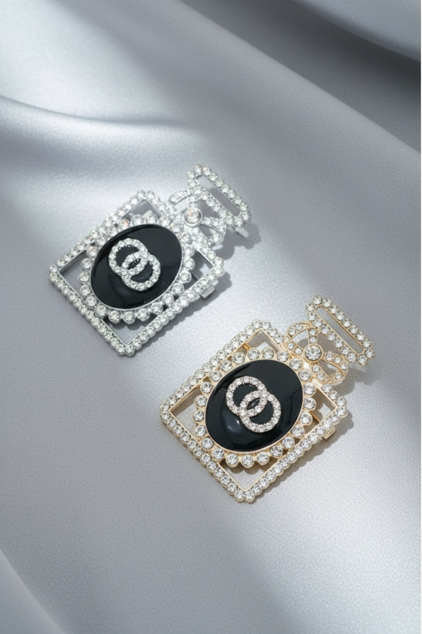 Make a statement with this luxurious crystal pavé perfume bottle brooch—a collectible pin that instantly elevates blazers, coats, scarves, and handbags with vintage-inspired glamour. The iconic perfume bottle silhouette features a black enamel center medallion with sparkling rhinestone logo detail, all framed by brilliant pavé crystals that catch the light from every angle.