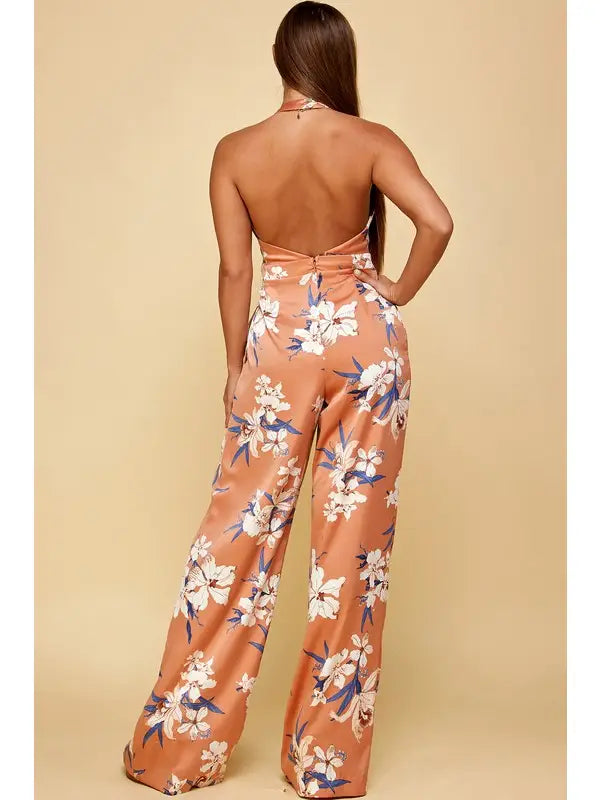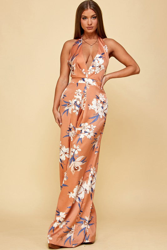 Turn heads in this stunning floral silk halter jumpsuit—your new one-and-done statement piece. Designed with a plunging V-neckline, button-back halter closure, and a hidden back zipper for a sleek fit. The lightweight silk drapes beautifully, while functional pockets add just the right touch of ease. Whether you're headed to a rooftop party, vacation dinner, or a summer wedding, this jumpsuit brings effortless elegance in full bloom.