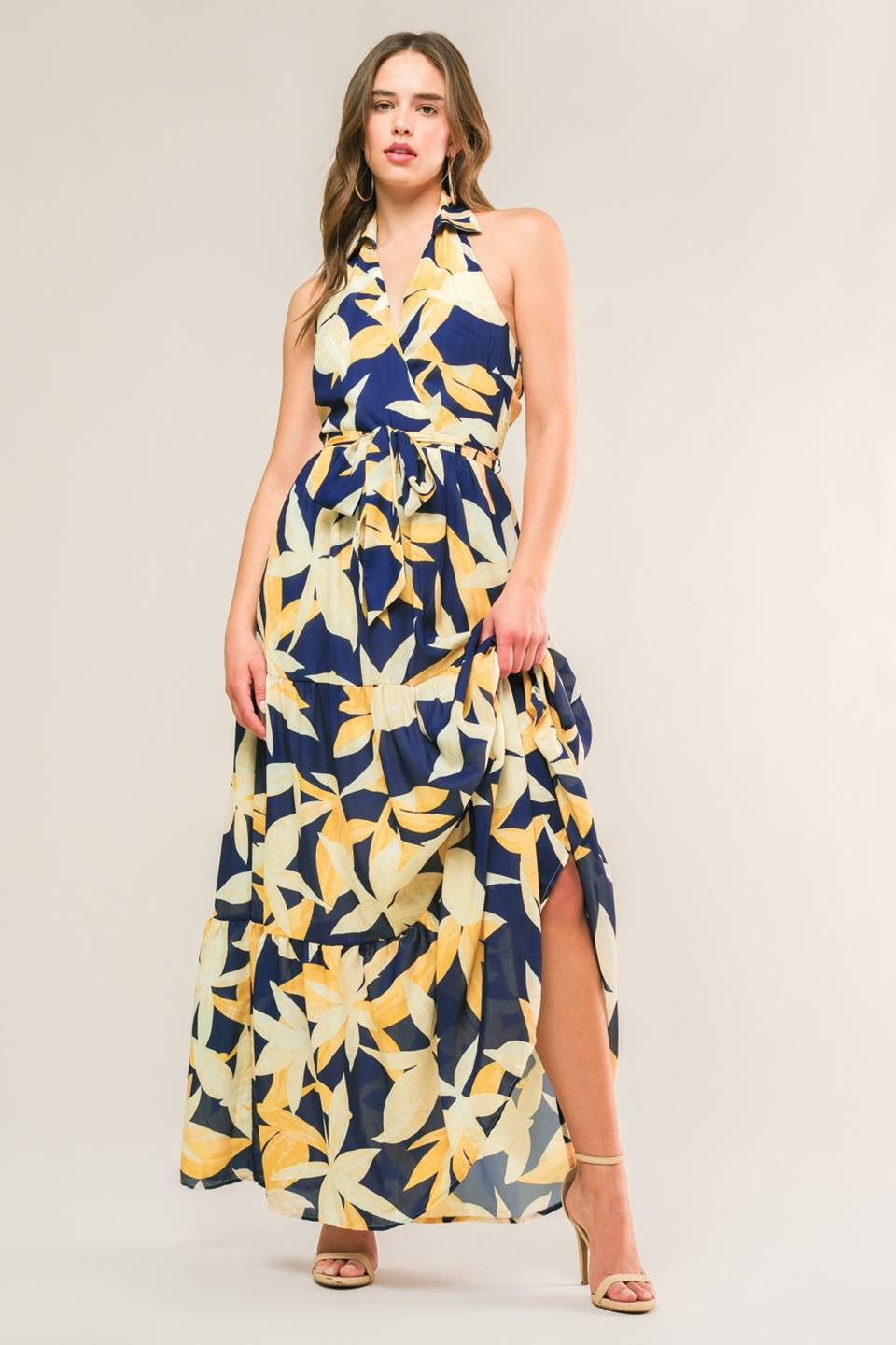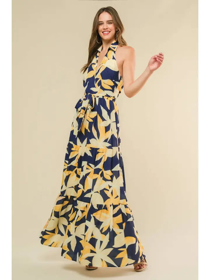 Floral Print Halter Summer Maxi Dress - Navy/Yellow