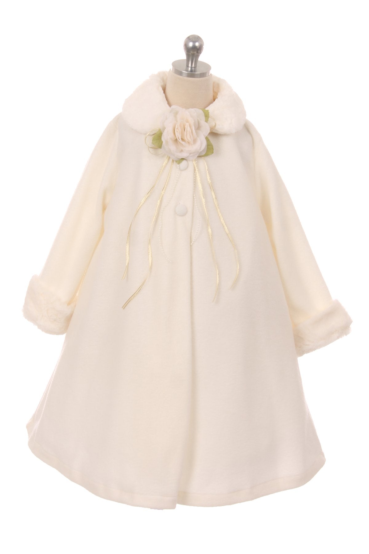 This girls’ ivory fleece cape-style coat is the perfect blend of warmth and elegance. Designed with soft, top-quality fleece and trimmed in luxurious faux fur, it offers both comfort and style for any special occasion. The look is completed with a delicate corsage accent, adding a touch of sophistication to this timeless piece.