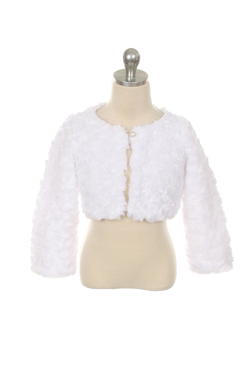 Trending now as a must-have accessory for flower girls and young bridesmaids, this faux fur bolero offers both comfort and timeless charm.