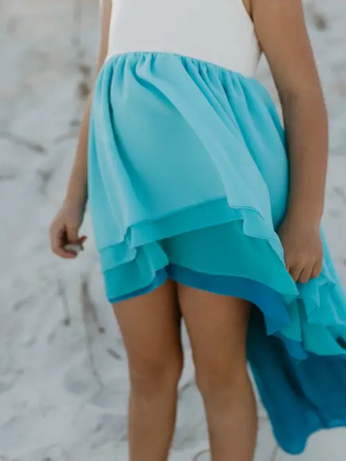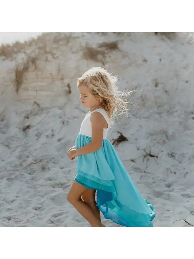 Let her shine in this beautiful Blue Ombre Tiered High-Low Dress, perfect for summer days and special occasions. Featuring a crisp white sleeveless bodice and a flowing multi-layered sheer skirt in ocean-inspired ombré shades of blue, this dress offers effortless style and movement. The high-low hem adds playful drama while keeping her comfortable and cool. Whether she's twirling at the beach, celebrating a birthday, or attending a summer wedding, this dress is a dreamy addition to her warm-weather wardrobe.