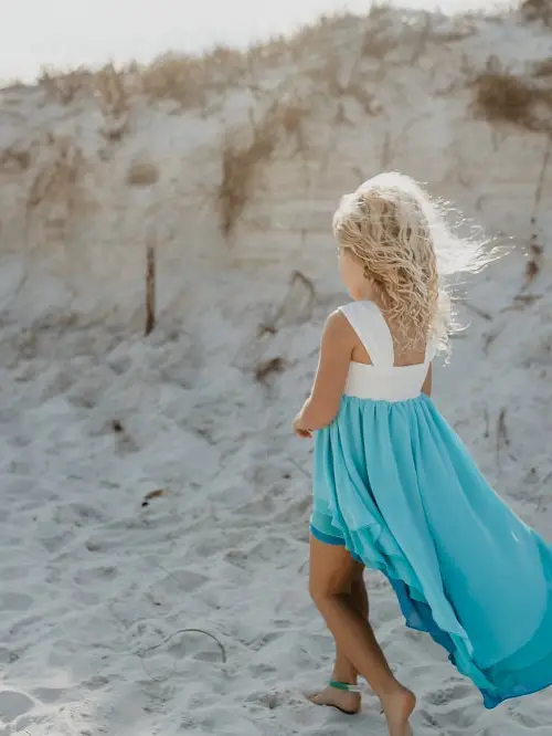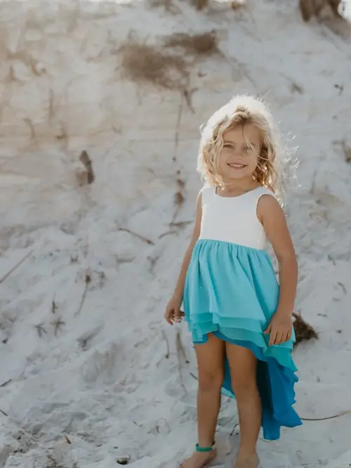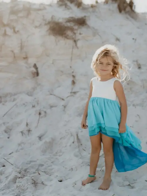 Trending Now: High-low dresses, ombré blue tones, girls’ summer fashion, beach dresses for kids.