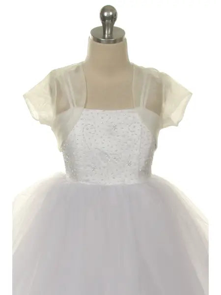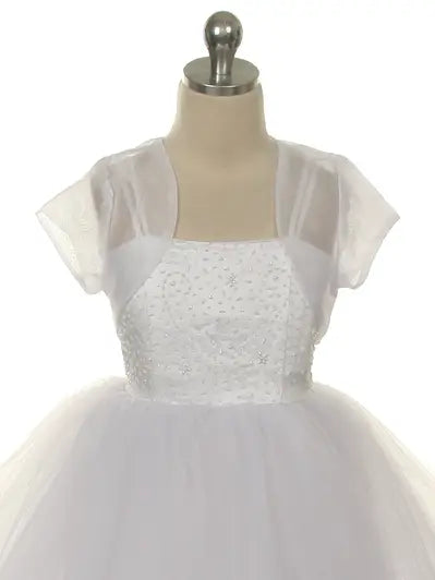 Add a touch of elegance to her formal look with this classic short organza bolero, available in ivory or white. Designed with delicate sheer fabric and short sleeves, this lightweight layering piece is perfect for pairing with sleeveless dresses. Whether for a wedding, communion, or special event, this bolero provides just the right amount of coverage without compromising style.