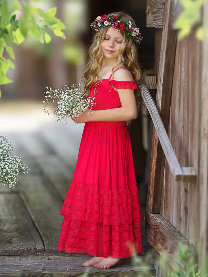 Girls' Ruby Red Tiered Lace Ruffle Maxi
