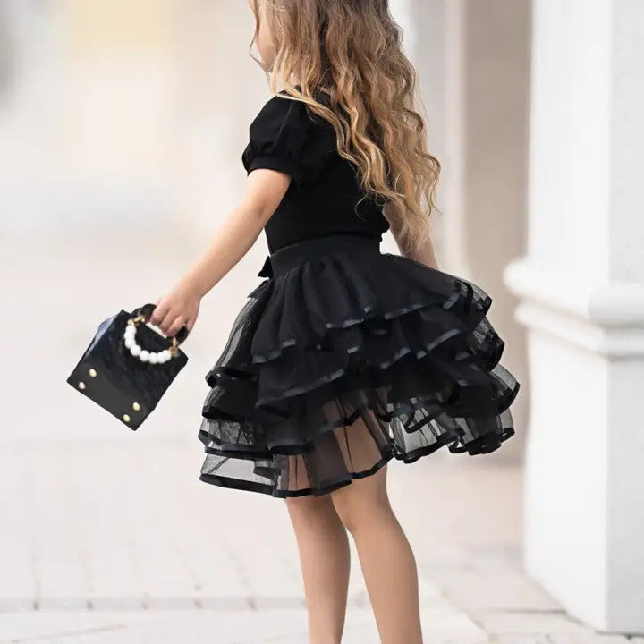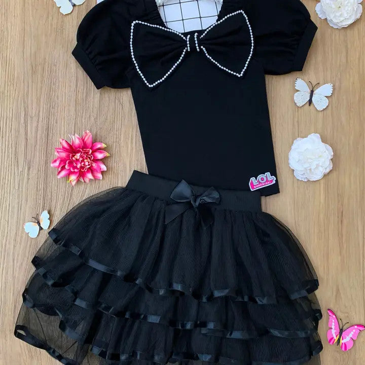 Chic and playful, this 2-piece set is designed for the little fashionista who loves to shine. The top features a pearl-embellished oversized bow that adds instant elegance, while the layered black tulle skirt creates volume and charm with every step. A satin bow accent at the waist completes this couture-inspired look.