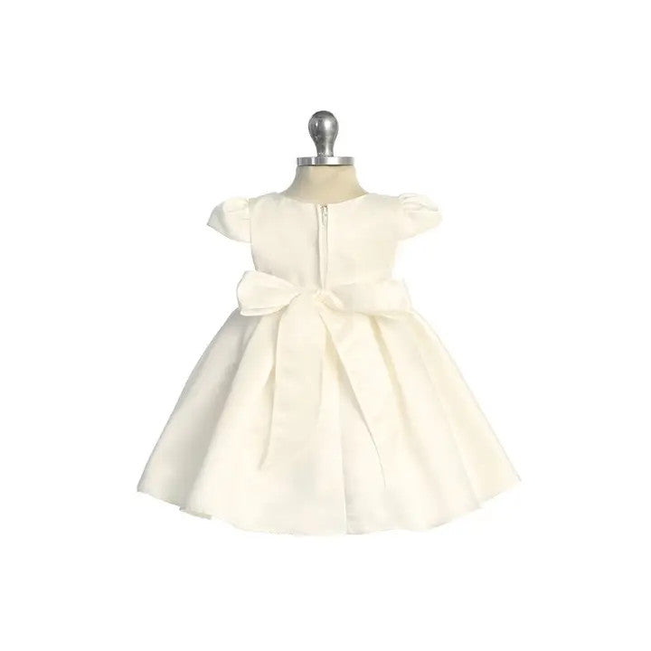 This elegant infant ivory satin dress is a timeless choice for your baby girl’s most cherished occasions. Fully lined for comfort, it features a classic box-pleated skirt and a soft tulle underskirt for gentle volume.