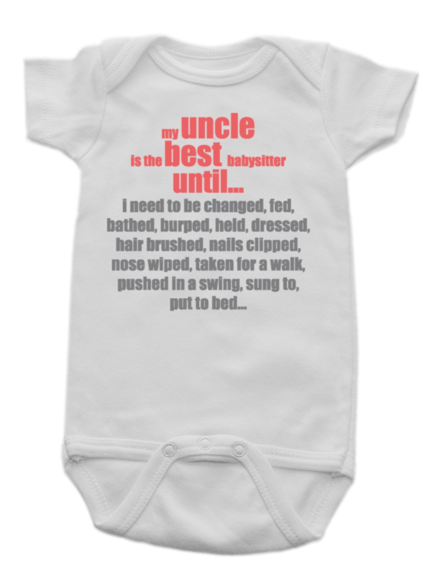 Celebrate the special (and funny) bond between baby and uncle with this playful white baby onesie. The bold design reads “My uncle is the best babysitter until…” followed by a hilarious list of baby duties like being changed, fed, burped, bathed, dressed, and more. Crafted from soft cotton with convenient snap closures, this onesie is as comfortable as it is entertaining—making it a unique gift for proud uncles and a guaranteed laugh at family gatherings.