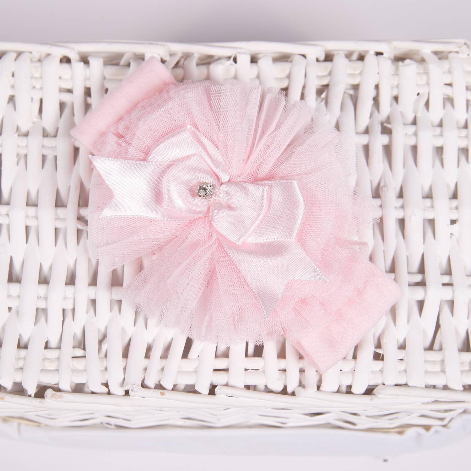 This pink baby headband is designed to make every moment picture-perfect. Crafted from super soft, stretchy fabric, it features a layered satin and tulle bow with a sparkling rhinestone detail at the center. The wide, comfortable band fits gently on little heads, keeping your baby stylish and cozy from newborn to 12 months.