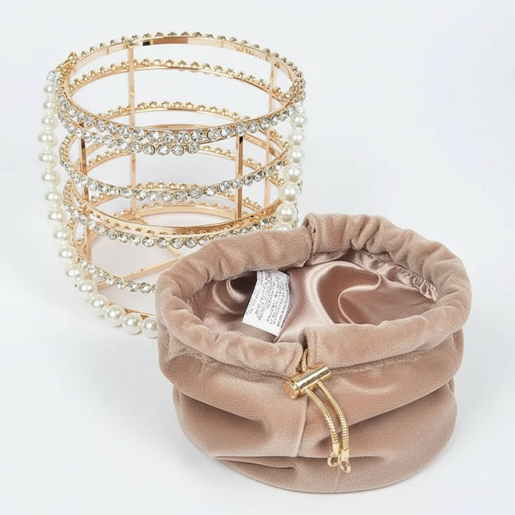 - Soft nude velvet interior pouch with drawstring closure