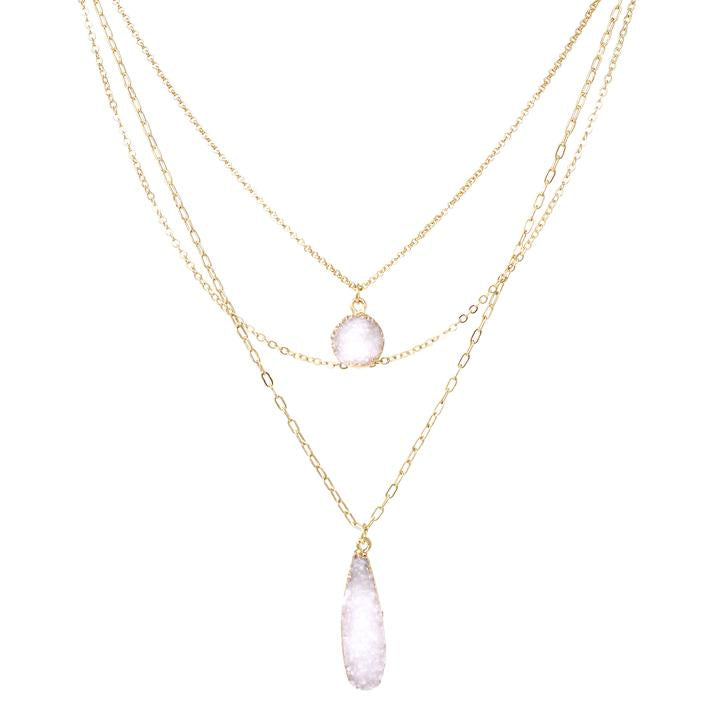 Round/Teardrop Druzy Stone Pendant Triple Layer Necklace - White