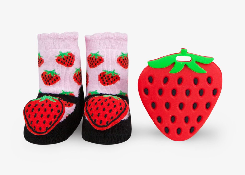 This adorable set features a Strawberry Baby Teether and a cute pair of Strawberry rattle socks, making it a delightful gift for a baby girl or a fun baby shower surprise.