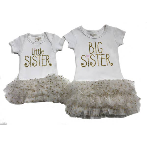Celebrate the joy of sisterhood with this sweet “Big Sister” toddler dress. Made with a soft white cotton short-sleeve top and a playful tutu skirt, it’s accented with shimmering gold lettering and heart details for a touch of sparkle. Designed to coordinate perfectly with our “Little Sister” baby dress, this outfit is a picture-perfect choice for sibling sets, family photos, or milestone celebrations. Comfortable enough for play yet stylish enough for parties, it’s a keepsake piece that makes big sisters shine.